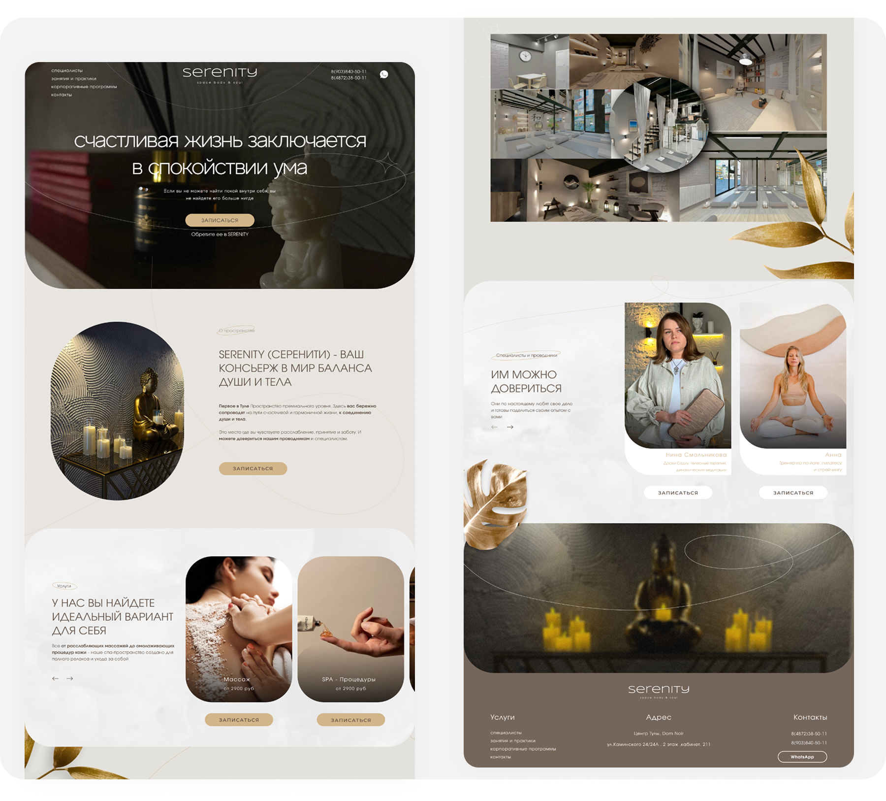 Создать уникальный и эстетически выверенный сайт для центра Serenity — пространства заботы о теле и душе. Проект должен был транслировать атмосферу уюта, доверия и профессионализма, выгодно выделять бренд на фоне конкурентов и обеспечивать комфортное онлайн-взаимодействие с клиентами.