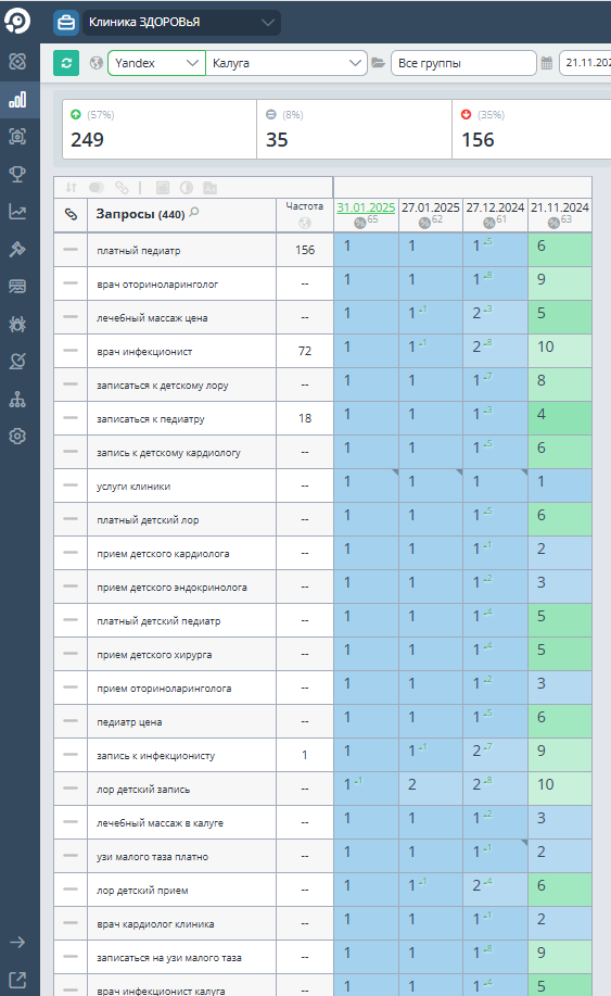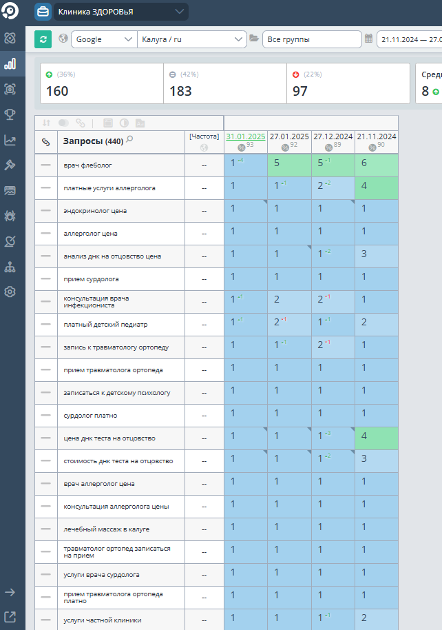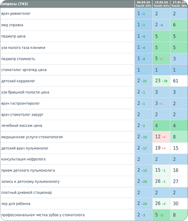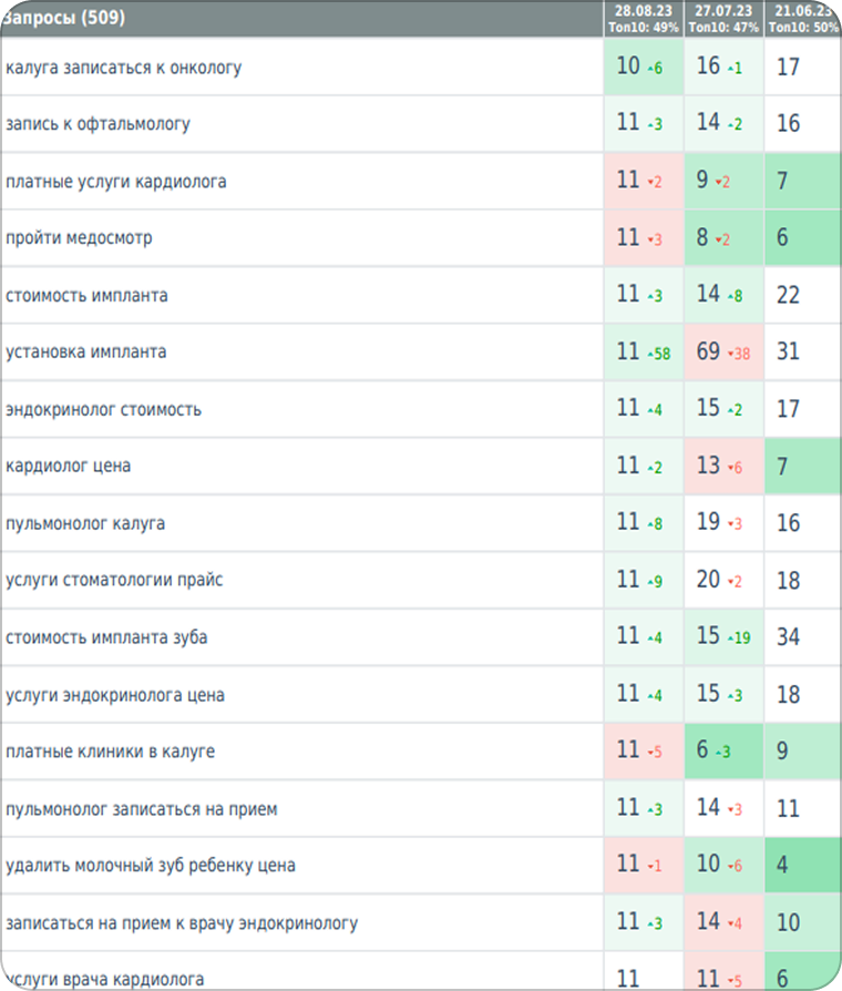 Ранее мы работали с компанией «Клиника ЗДОРОВьЯ» по seo-продвижению сайта и достигли положительной динамики позиций по запросам. Во время продвижения сайта 2023-2024 году были добавлены новые запросы в семантическое ядро и по сравнению с 2023 годом позиции по запросам в 2024 году заметно подросли.