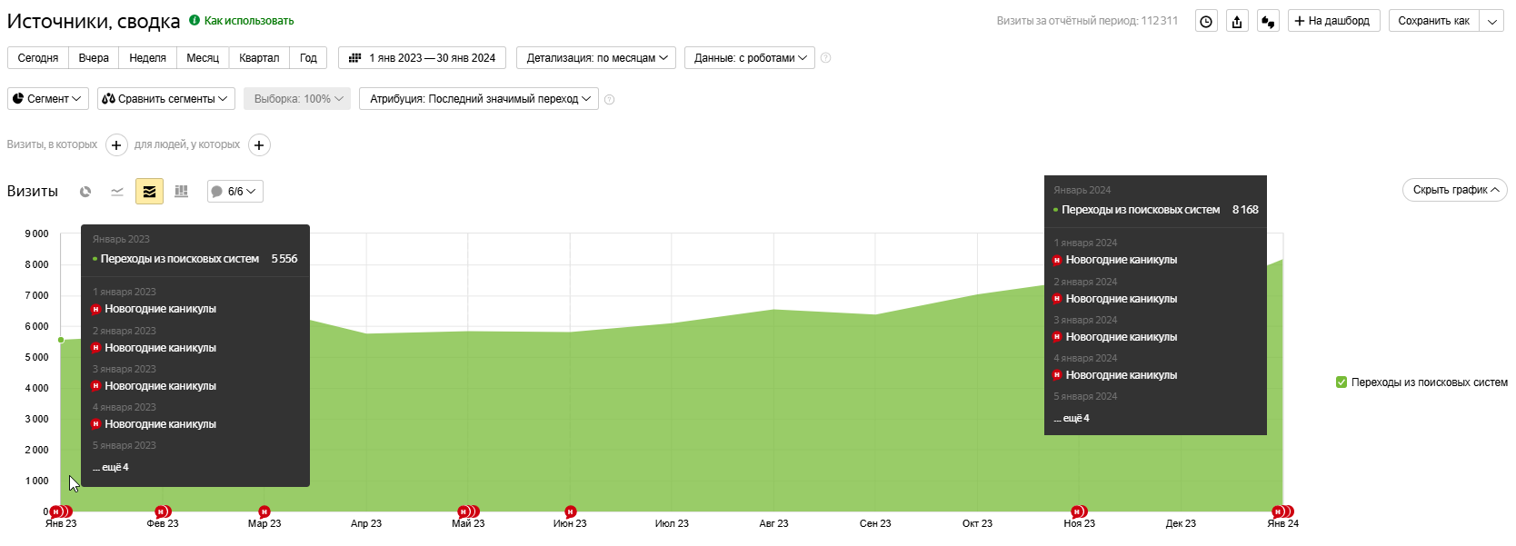 Поисковый трафик по отношению 2023 и 2024 увеличился. С 5 556 визитов (январь 2023) до 8 168 визитов (январь 2024)