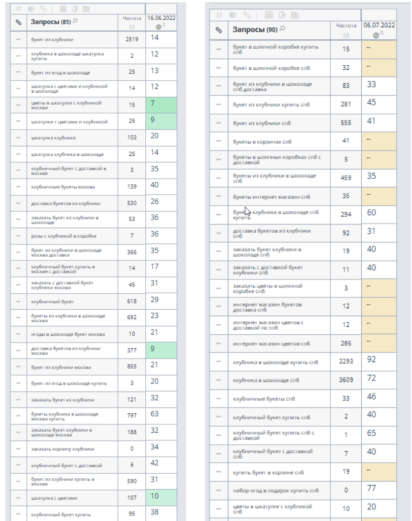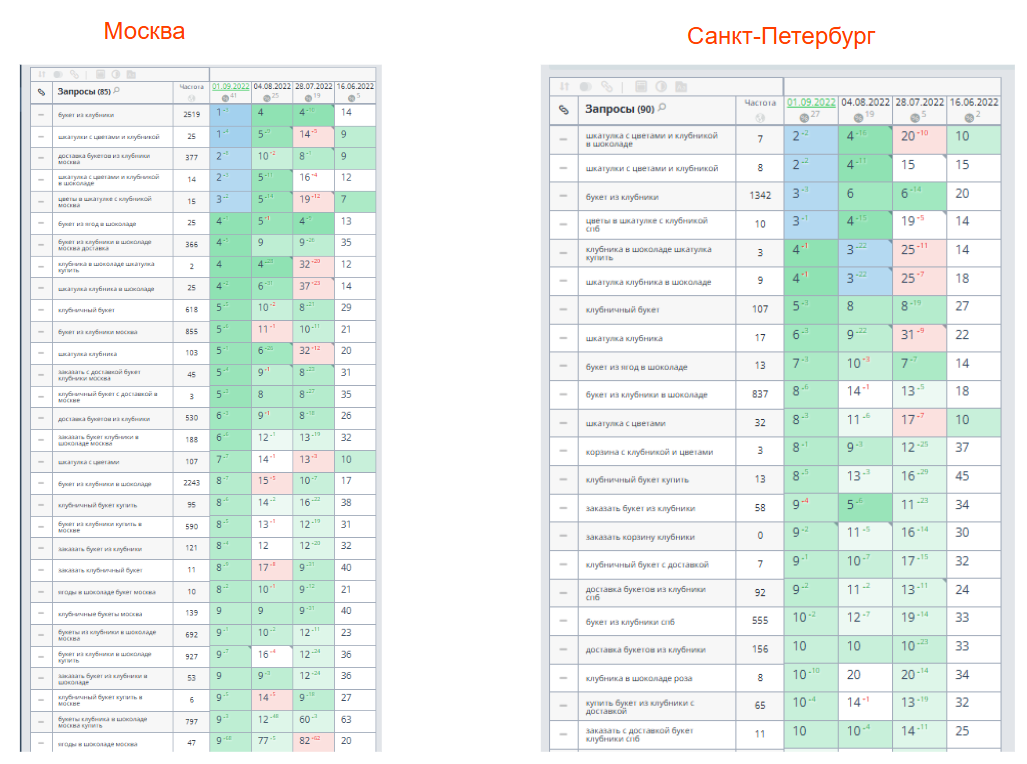 Для повышения эффективности SEO-продвижения мы зафиксировали текущие позиции сайта в поисковой выдаче для Москвы и Санкт-Петербурга.