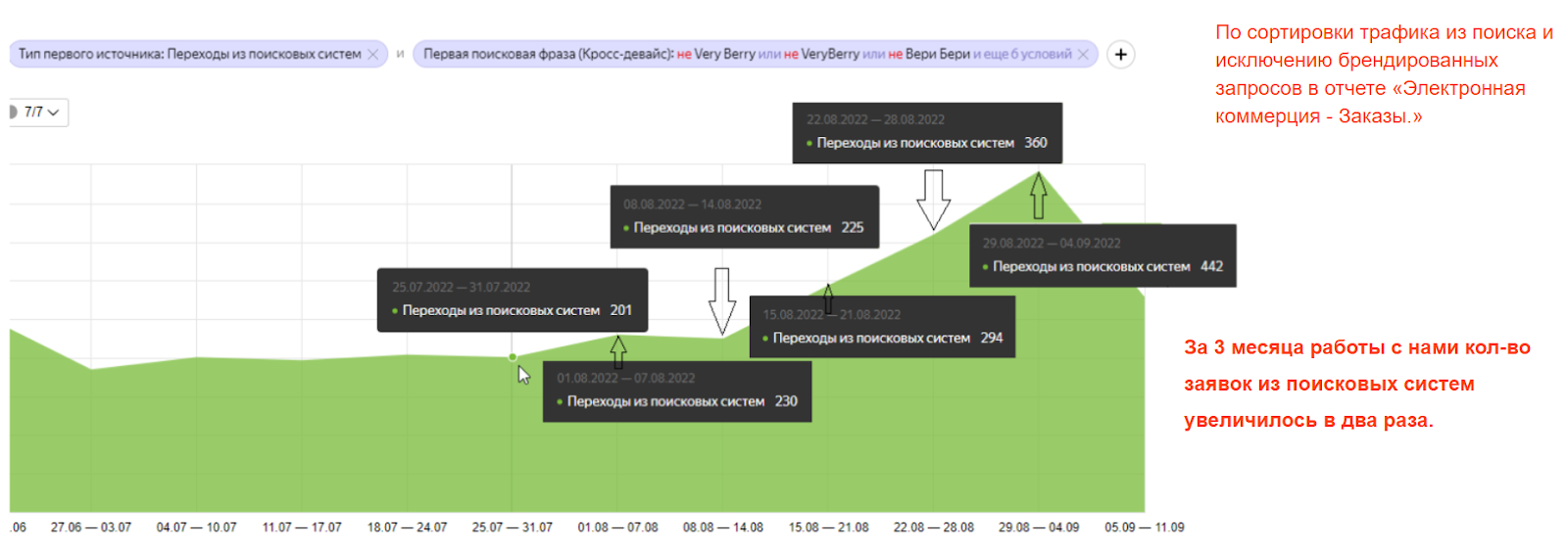 - Увеличение лидов и заказов через органический поиск за счет улучшения видимости для конверсионных запросов и повышения удобства пользования сайтом.
